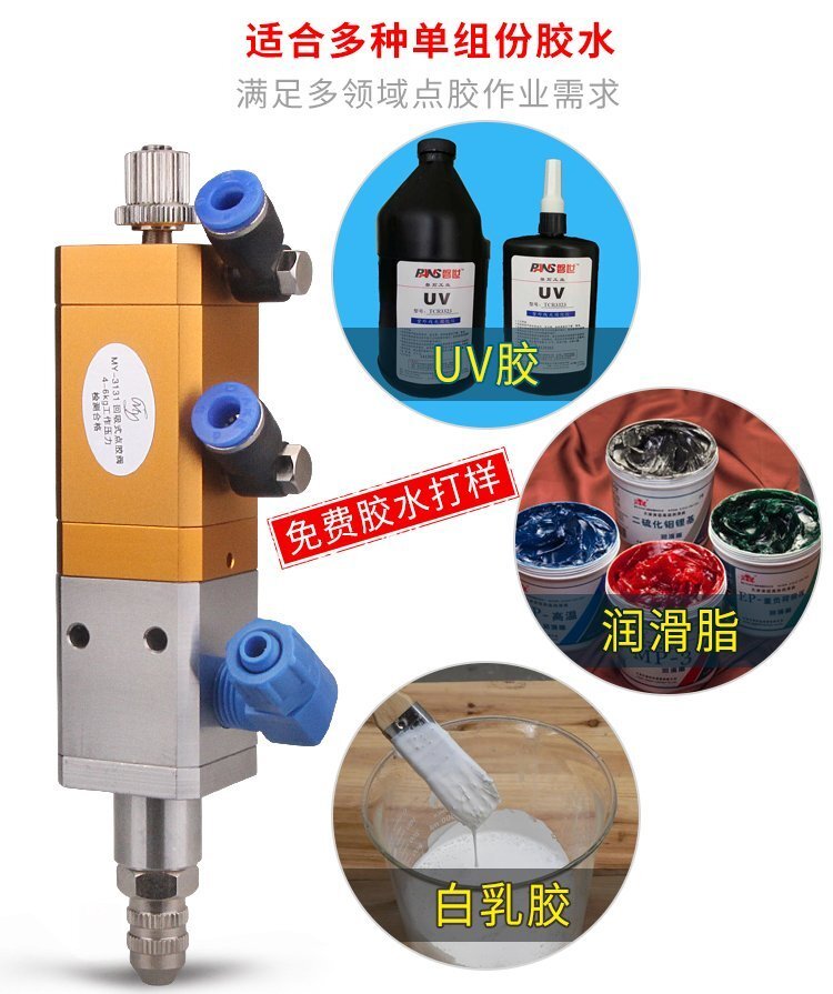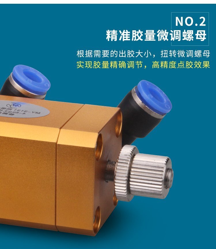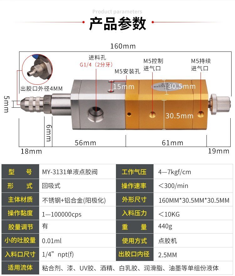 MY-3131可調回吸式點膠閥,適合流動性差,中高粘度性膠水,如:油脂、硅膠、 環氧樹脂、黃膠、錫膏等;回吸式點膠閥采用向上運動關膠結構,使停膠同時瞬間回吸斷膠,減少余留針頭上的殘膠,使點膠不產生漏滴、拉絲等現象,可接各式點膠針頭;采用鋁合金陽極化+不銹鋼優質材料制造,不生銹防腐蝕,適合工程/工廠長期生產使用;有大量現貨供應,歡迎咨詢采購!