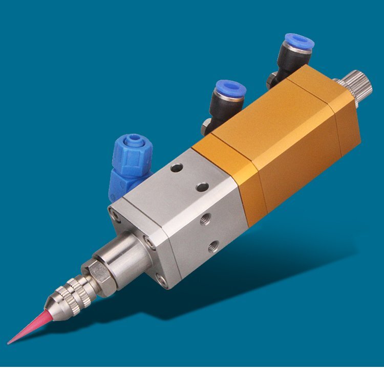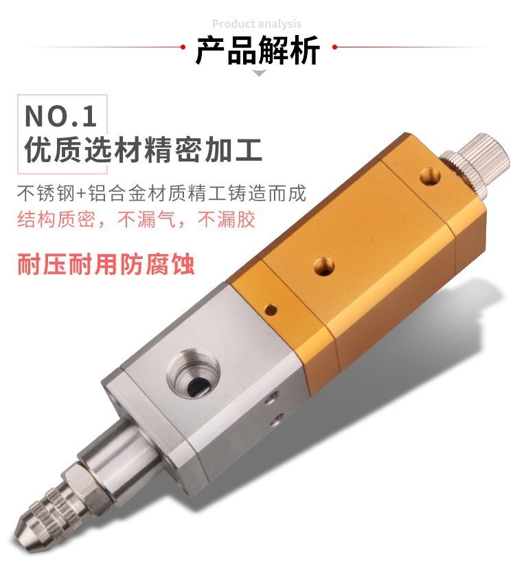 氣動:點膠閥由氣缸、閥體和料缸三部分上下連接而成,氣缸和閥體用先進密封材料隔開,避免膠水侵入氣缸。料缸和氣缸連接在點膠閥閥主體上,與氣缸保證同心度。用電磁閥氣動氣缸運動,從而驅動中心桿上下運動,利用中心桿的上下運動達到對膠水的開啟和關斷作用。根據開啟和關斷的方式不同,從而分為:柱塞式點膠閥、頂針式點膠閥、提升式點膠閥、噴霧點膠閥、噴射點膠閥;開關方式不同,適用的流體也就不同,回吸式點膠閥采用向上運動關膠結構,使停膠同時瞬間回吸斷膠,減少余留針頭上的殘膠,使點膠不產生漏滴、拉絲等現象。膠閥本體經鋁合金陽極氧化處理,密封材料采用最新四氟材料,接觸膠體部分均為耐腐蝕材料。