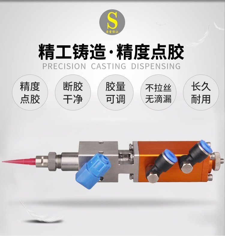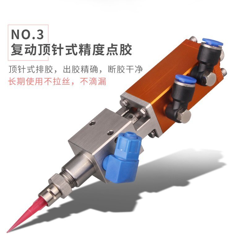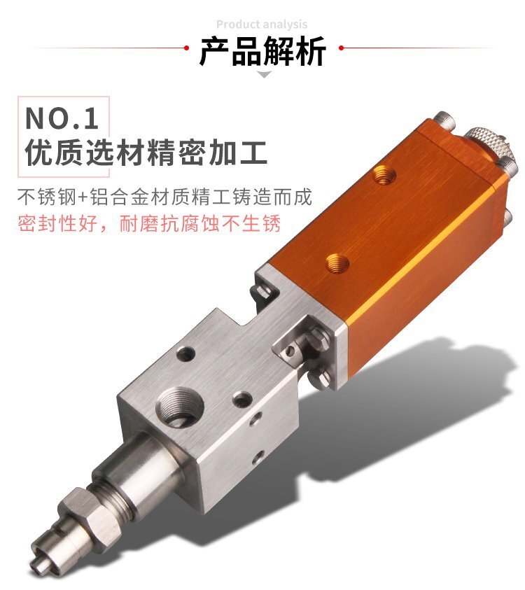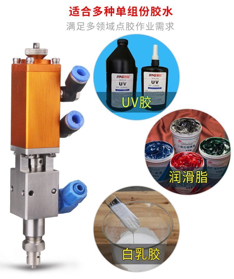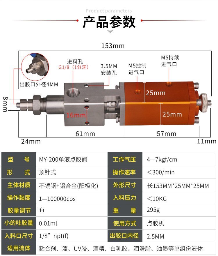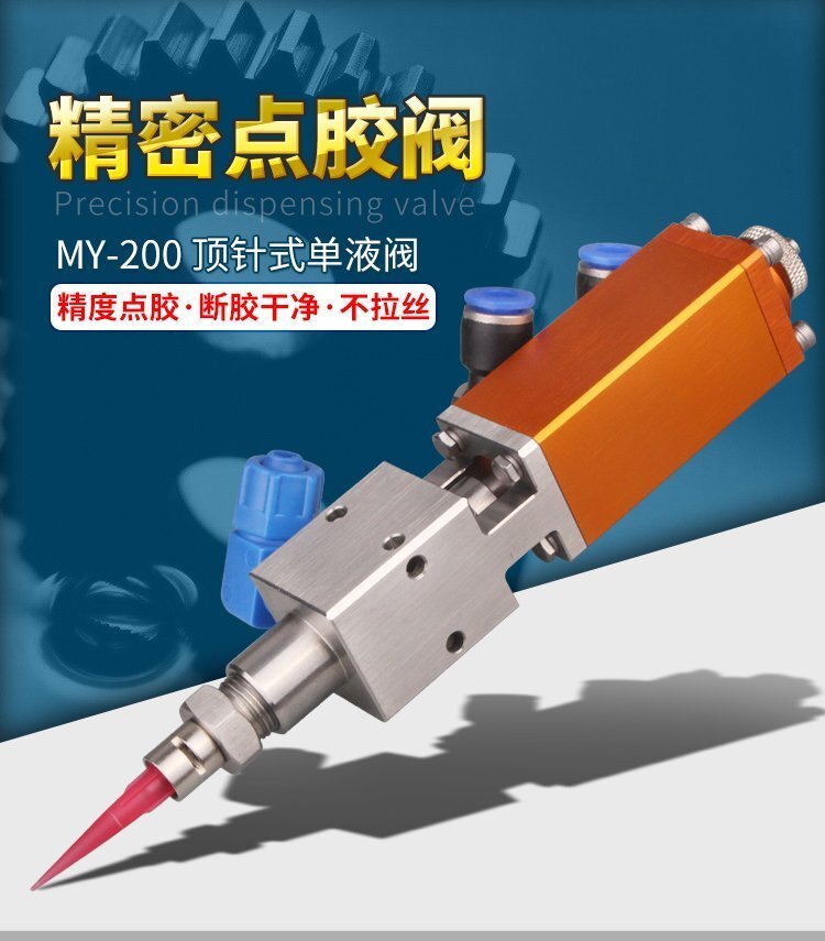 MY-200精密頂針式點膠閥,適用于流動性較好的膠水及低粘度的水狀液體,如UV 膠、硅膠、黃膠、墨水、油漆/酒精等;可與各種供料泵或儲料壓力桶使用,可接各式點膠針頭,可與全自動點膠機裝配數個點膠閥同時點膠作業;采用鋁合金陽極化+不銹鋼優質材料制造,不生銹防腐蝕,適合工程/工廠長期生產使用;有大量現貨供應,歡迎咨詢采購!