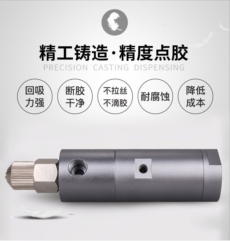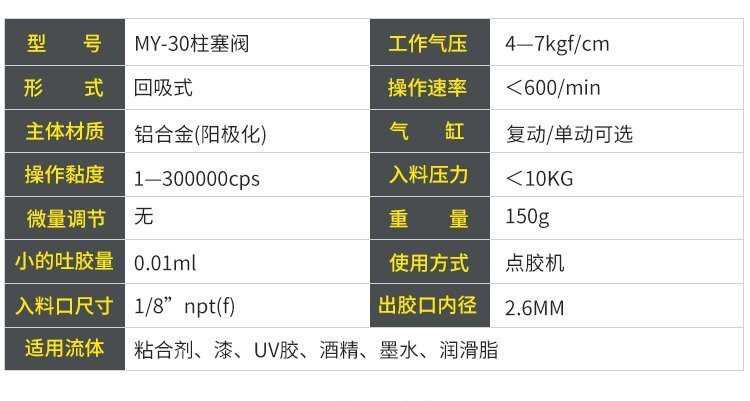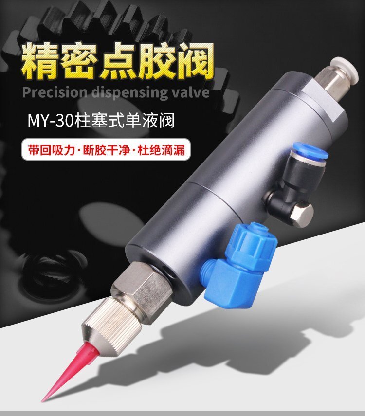 MY-30柱塞式單液點膠閥,帶回吸功能,點膠精確、出膠順暢、不拉絲、不滴漏; 可與各種供料泵或儲料壓力桶使用,可接各式點膠針頭,可與全自動點膠機裝配數個點膠閥同時點膠作業;采用鋁合金陽極化+不銹鋼優質材料制造,不生銹防腐蝕,適合工程/工廠長期生產使用;有大量現貨供應,歡迎咨詢采購!
