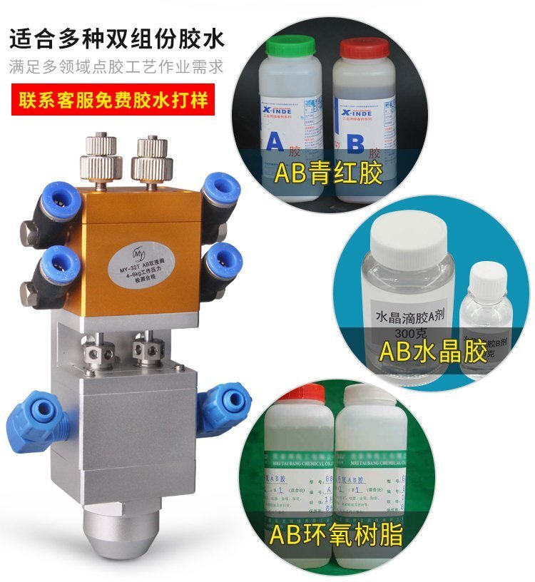 MY-32T復動隔離回吸式AB雙液閥,采用多重密封技術,專門為雙組份膠水混合而 設計,適合各種雙組份膠水,如:青紅膠、環氧樹脂膠、硅膠等雙組份膠水;通過微調螺母調節膠量大小,具有回吸力強、出膠順暢、不拉絲、不滴漏、耐腐蝕等特點;采用鋁合金陽極化+不銹鋼優質材料制造,不生銹防腐蝕,適合工程/工廠長期生產使用;有大量現貨供應,歡迎咨詢采購!