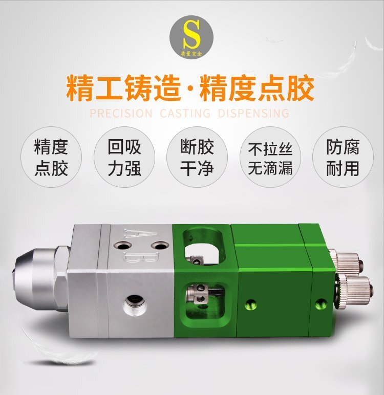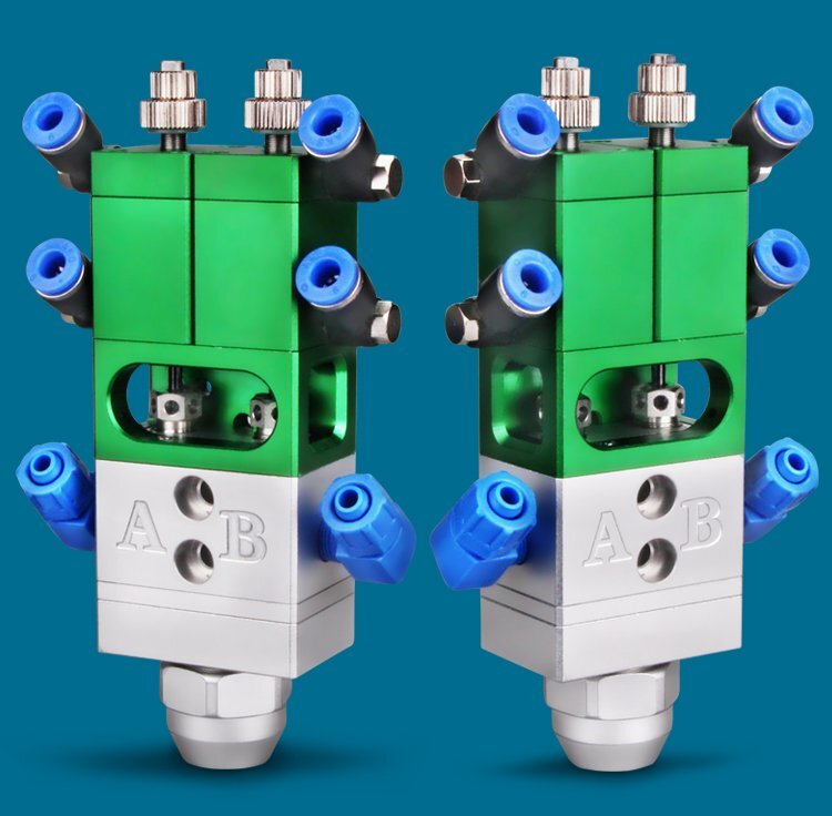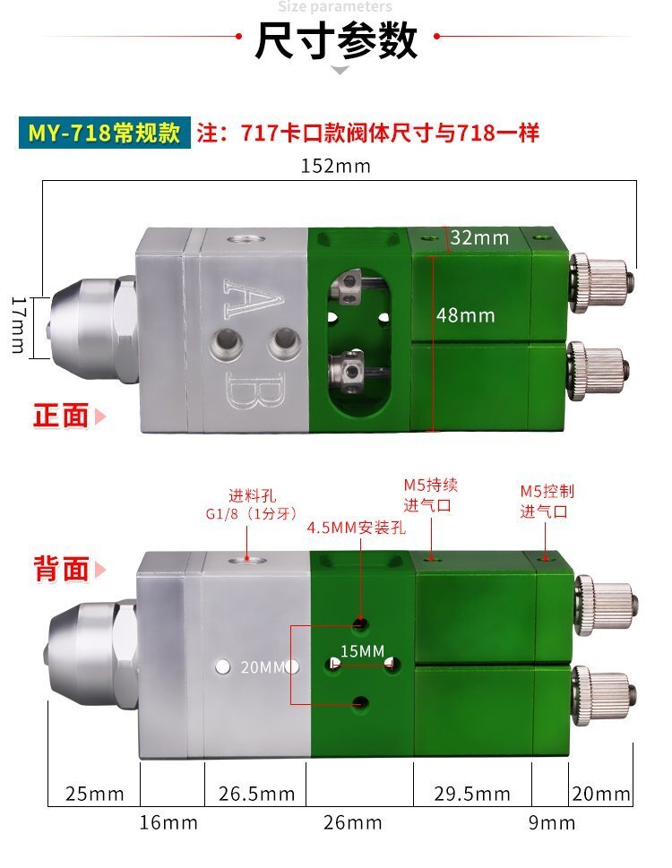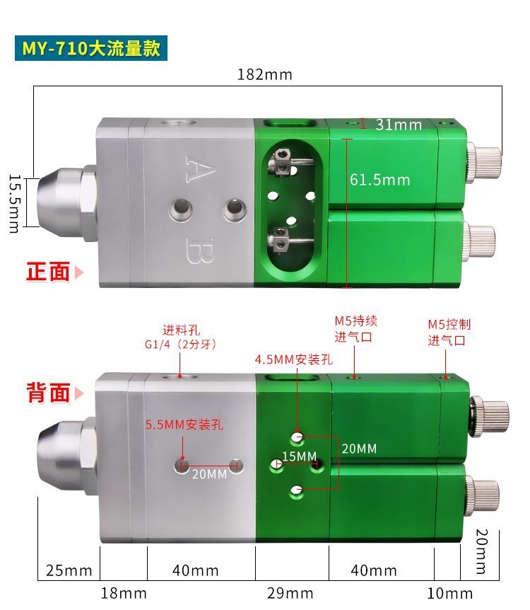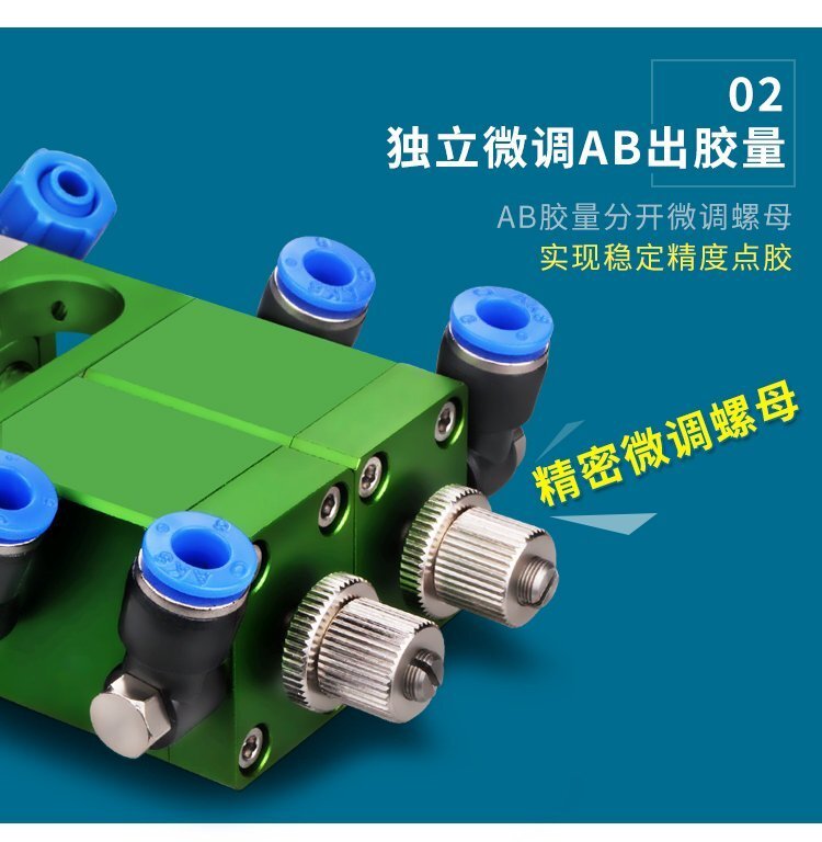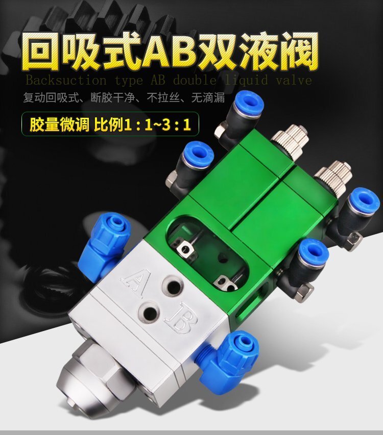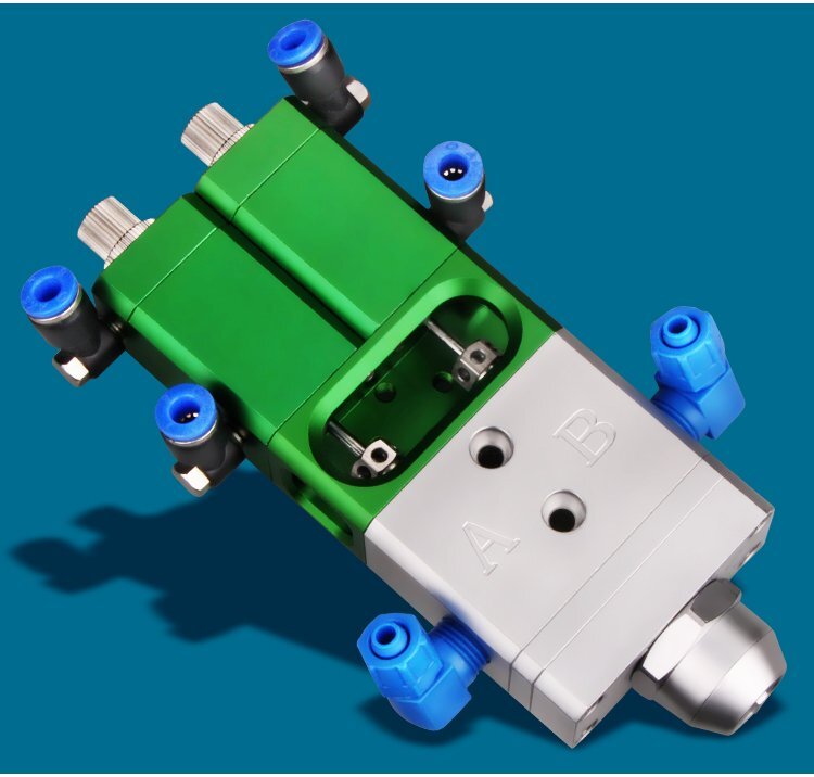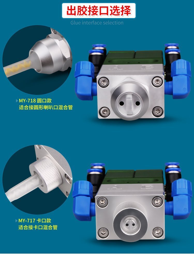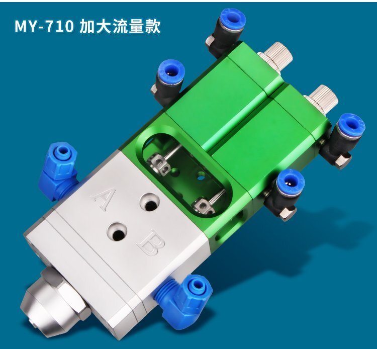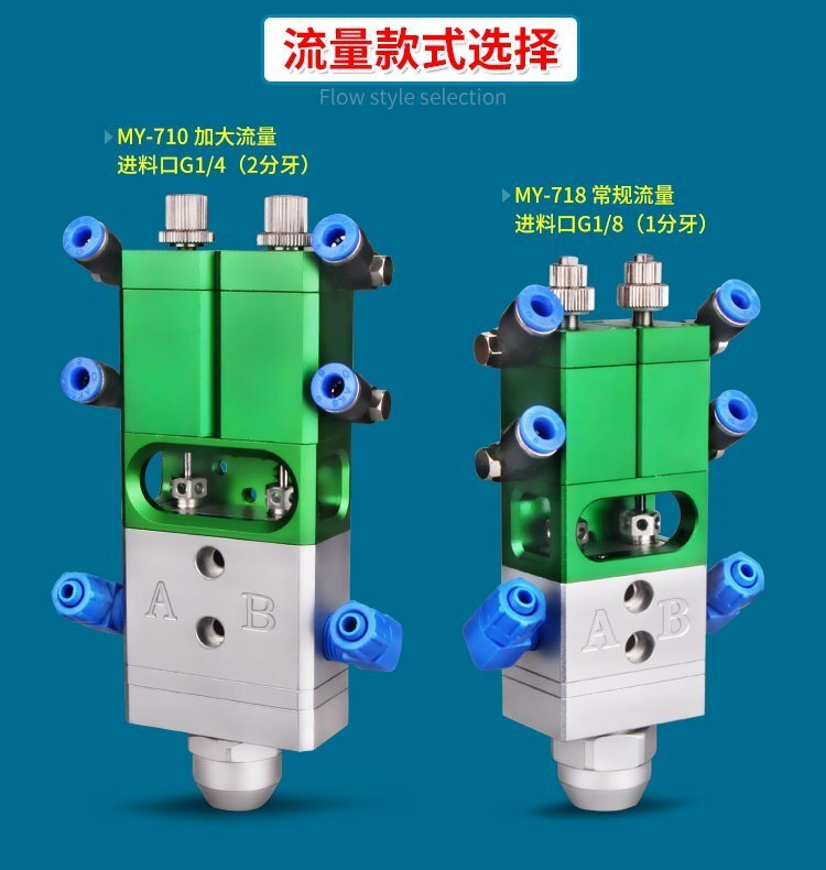 MY-718精密AB雙液點膠閥,比例1:1-3:1可選,出膠量可獨立微調,有圓口和卡口可選;適用流動性好,中低粘度性水狀流體,如青紅膠、封灌黑膠、AB環氧樹脂膠、水晶膠等雙組份膠水;可與各種供料泵或儲料壓力桶使用,可接各式點膠針頭,可與全自動點膠機裝配數個點膠閥同時點膠作業;采用鋁合金陽極化+不銹鋼優質材料制造,不生銹防腐蝕,適合工程/工廠長期生產使用;有大量現貨供應,歡迎咨詢采購!