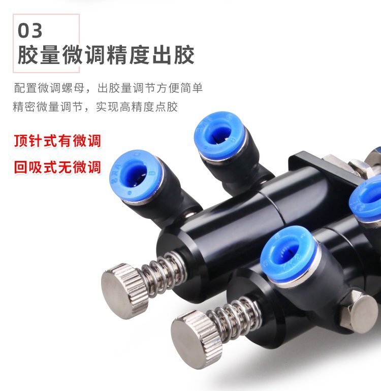 MY-D299AB雙液閥,有【頂針式卡口/回吸式卡口/回吸式圓口】三款可選,適合中低粘度性的AB雙組份膠水,如:封灌黑膠、AB硅膠、AB青紅膠、AB水晶膠、環氧樹脂膠;出膠量可以微調,膠水比例1:1精確出膠,具有回吸功能,避免拉絲現象,可接各式點膠針頭;采用聚甲醛+氟塑膠+不銹鋼優質材料制造,不生銹防腐蝕,適合工程/工廠長期生產使用;有大量現貨供應,歡迎咨詢采購!