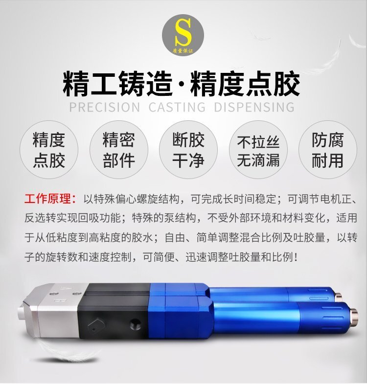 螺桿閥特點:精密螺桿閥外形輕巧,方便手握;操作簡單,靈活性強,點膠精度高。螺桿閥的應用領(lǐng)域:適用于焊錫膏,銀漿,紅膠,油脂,UV膠,硅膠等,應用于焊錫膏焊接,芯片粘結(jié),芯片封裝,圍壩等工藝采用Z向旋轉(zhuǎn)螺桿進行物料輸送,解決了氣壓點膠方式,由于氣體的可縮性所帶來的脈動,出膠量不一致的問題。電機正反轉(zhuǎn)分別控制,正向旋轉(zhuǎn)可使用物料按照需要的流量被均勻擠出,反向旋轉(zhuǎn)可實現(xiàn)熱熔膠的回吸,避免漏膠,拉絲等現(xiàn)象適合工程/工廠長期生產(chǎn)使用;有大量現(xiàn)貨供應,歡迎咨詢采購!