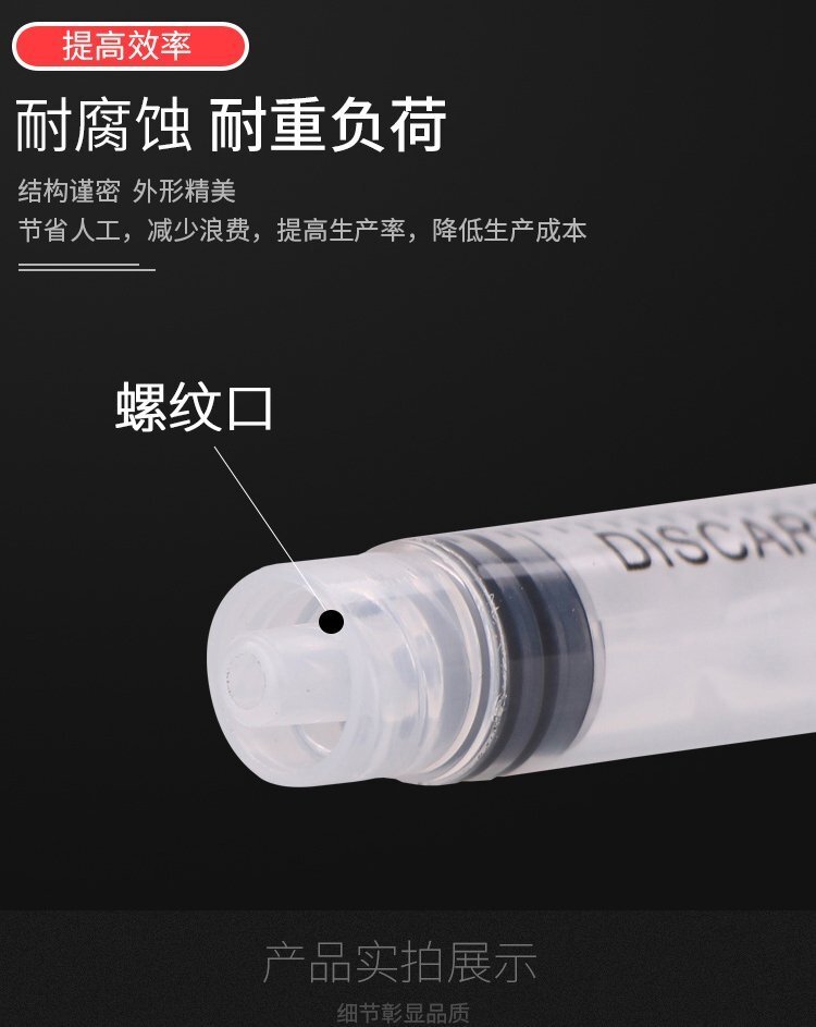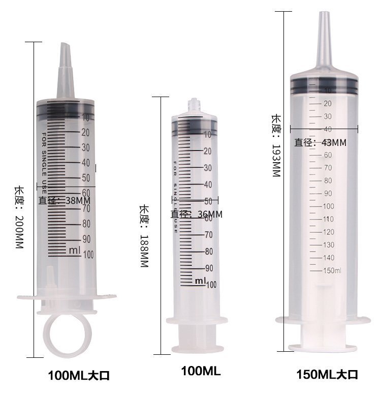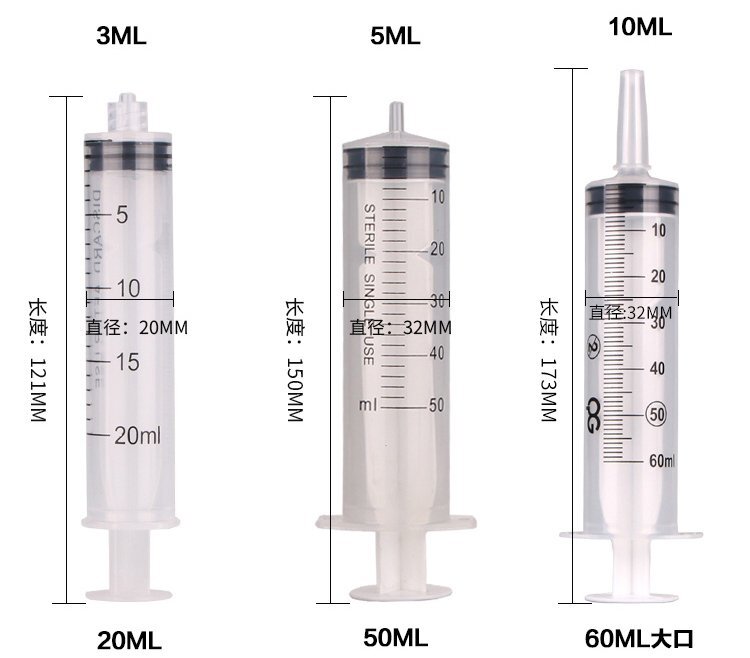 注射器塑料針筒,有螺口和大口兩種出膠口型可選,規格:3ML、5ML、10ML、20ML、50ML、60ML、3ML、100ML、150ML、200ML、250ML、300ML;采用環保型PP材料制造,耐磨耐用,不易破裂,適合工程/工廠長期生產使用;有大量現貨供應,歡迎咨詢采購!