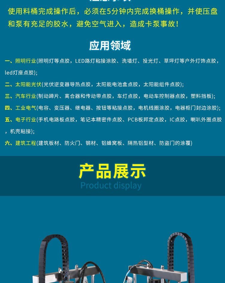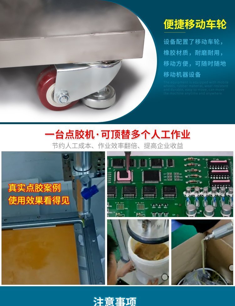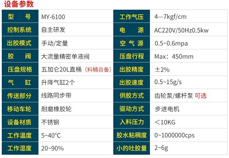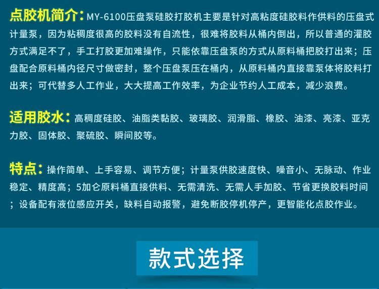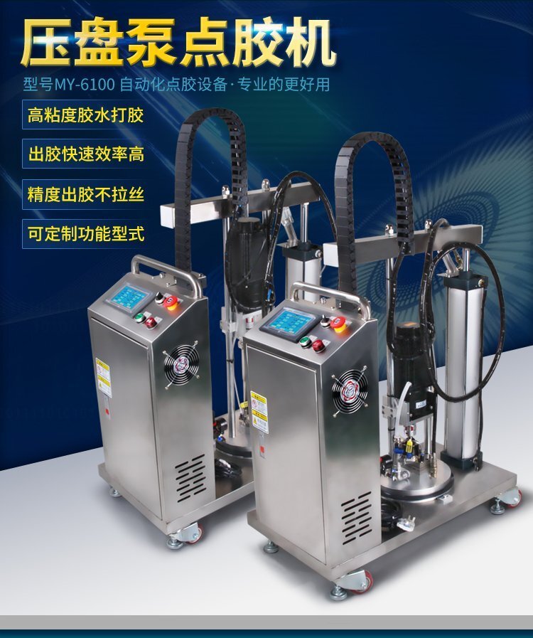 MY-6100高粘度壓盤點膠機,是由本公司自主研發設計,精密加工制造的一款高粘度硅膠壓盤泵單液點膠機,采用步進機驅動,齒輪泵/螺桿泵送料,使膠水能夠連續穩定輸出,精度高;主要用在電子行業、LED行業、工藝品行業等廣泛應用;具有高壓強出膠,升降大氣缸,出膠快速,持續穩定,高粘度膠水輕松壓出、快速調試設置出膠量、精度點膠、定時定 量出膠、智能檢測機器故障報警等功能;適合多種單組份膠水,如:高稠度硅膠、油脂類黏膠、玻璃膠、聚硫膠、潤滑脂、亞克力膠、油漆、固體膠、橡膠、亮漆、瞬間膠等工業膠水;出膠頭配置精密單液閥