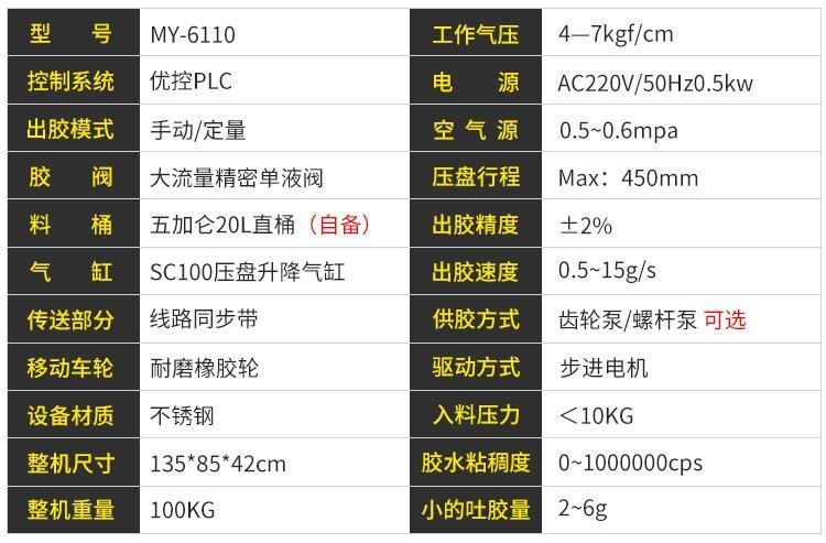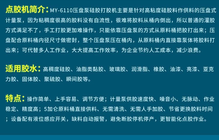 MY-6110高粘度壓盤(pán)點(diǎn)膠機(jī),是由本公司自主研發(fā)設(shè)計(jì),精密加工制造的一款高粘度硅膠壓盤(pán)泵單液點(diǎn)膠機(jī),采用步進(jìn)機(jī)驅(qū)動(dòng),齒輪泵/螺桿泵送料,使膠水能夠連續(xù)穩(wěn)定輸出,精度高;主要用在電子行業(yè)、LED行業(yè)、工藝品行業(yè)等廣泛應(yīng)用;具有高壓強(qiáng)出膠,升降大氣缸,出膠快速,持續(xù)穩(wěn)定,高粘度膠水輕松壓出、快速調(diào)試設(shè)置出膠量、精度點(diǎn)膠、定時(shí)定 量出膠、智能檢測(cè)機(jī)器故障報(bào)警等功能;適合多種單組份膠水,如:高稠度硅膠、油脂類(lèi)黏膠、玻璃膠、聚硫膠、潤(rùn)滑脂、亞克力膠、油漆、固體膠、橡膠、亮漆、瞬間膠等工業(yè)膠水;出膠頭配置精密單液閥