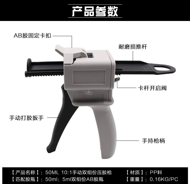 此款膠槍為50毫升AB膠筒10:1專用,推桿式結構,打膠高效省力;采用特殊材料制造,不易斷裂,適合工程/工廠長期生產使用;有大量現貨供應,歡迎咨詢采購!