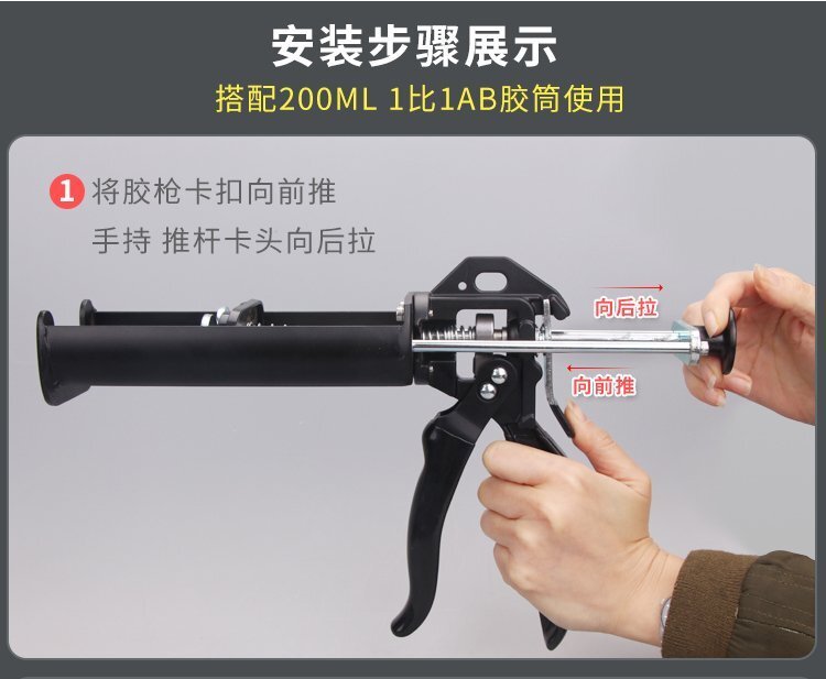 此款膠槍為200毫升AB膠筒1:1專用,推桿式結構,打膠高效省力;膠槍整體采用推桿質密金屬材質,防腐蝕不生銹,不彎曲變形,抗壓耐磨,適合工程/工廠長期生產使用;有大量現貨供應,歡迎咨詢采購!