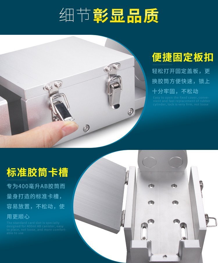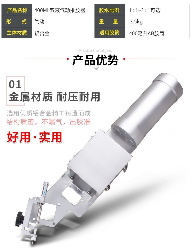 400ml氣動ab雙液推膠器,采用優質鋁合金材料制造,抗壓耐用,不生銹防腐蝕,配置止漏閥,止膠干凈,不拉絲不滴漏,實現高精度點膠效果,可與各種自動化設備搭配使用;適合工程/工廠長期生產使用;有大量現貨供應,歡迎咨詢采購!