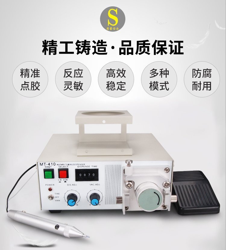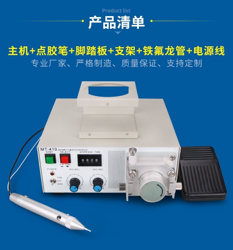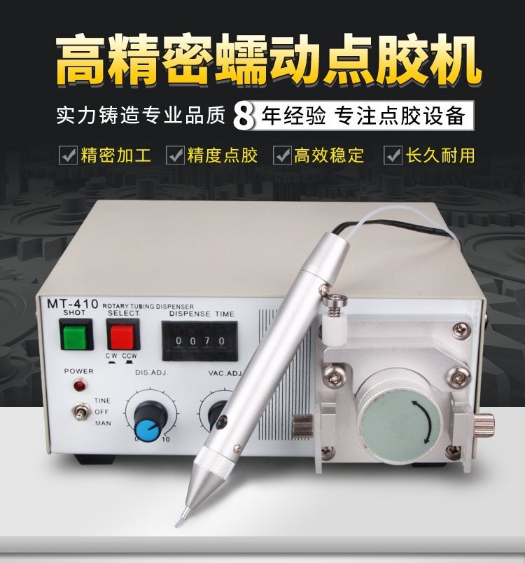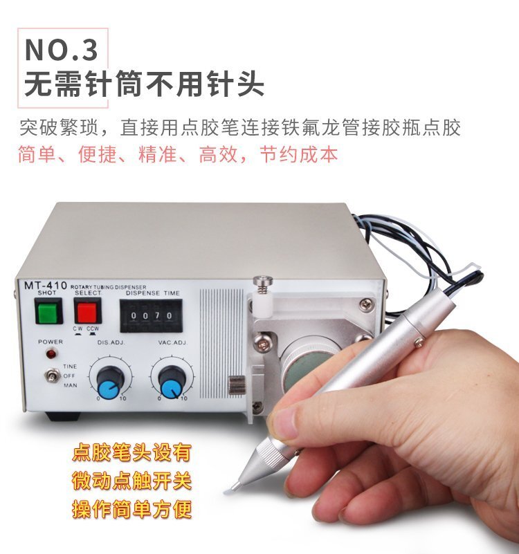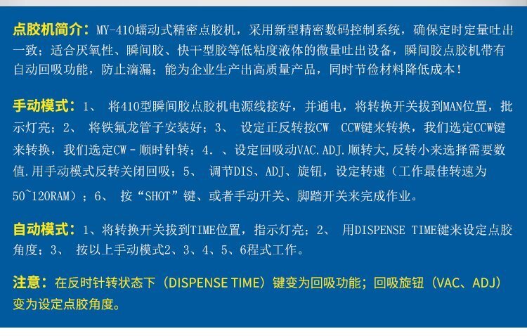 MY—410快干點膠機,內置高精密電位器,可調節點膠時間,配有防止漏膠的真空機,適合厭氧性、瞬間膠、快干型膠等低粘度液體的微量吐出設備。使用完畢后不需要進行清理調節。 轉子部分可以進行安裝與拆卸,提高了維護性能。管狀旋轉出膠控制結構;數字式時間控制器;點膠筆頭設微動點觸開關,方便操作;瞬間膠點膠機不需要空氣壓,只需電源即可工作;材料可直接使用原裝容器;可快速使交換出膠管,無需整理;瞬間膠點膠機帶有自動回吸功能,防止滴漏;構;備有手動(MAN)/定量(TIME)兩種模式的點膠功能,具有從0.05Mpa的低壓