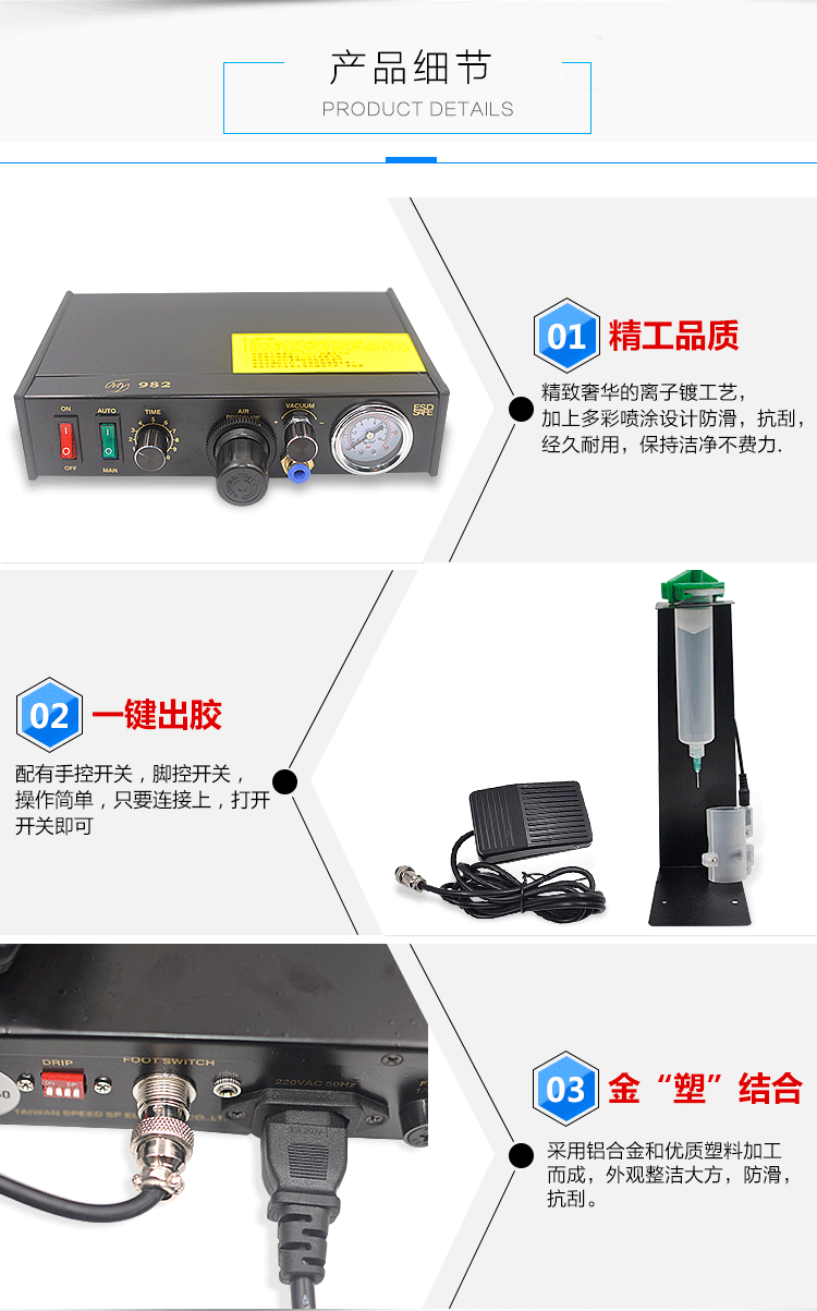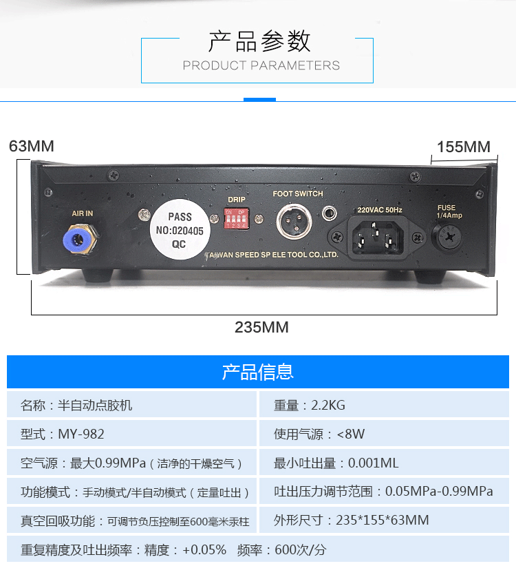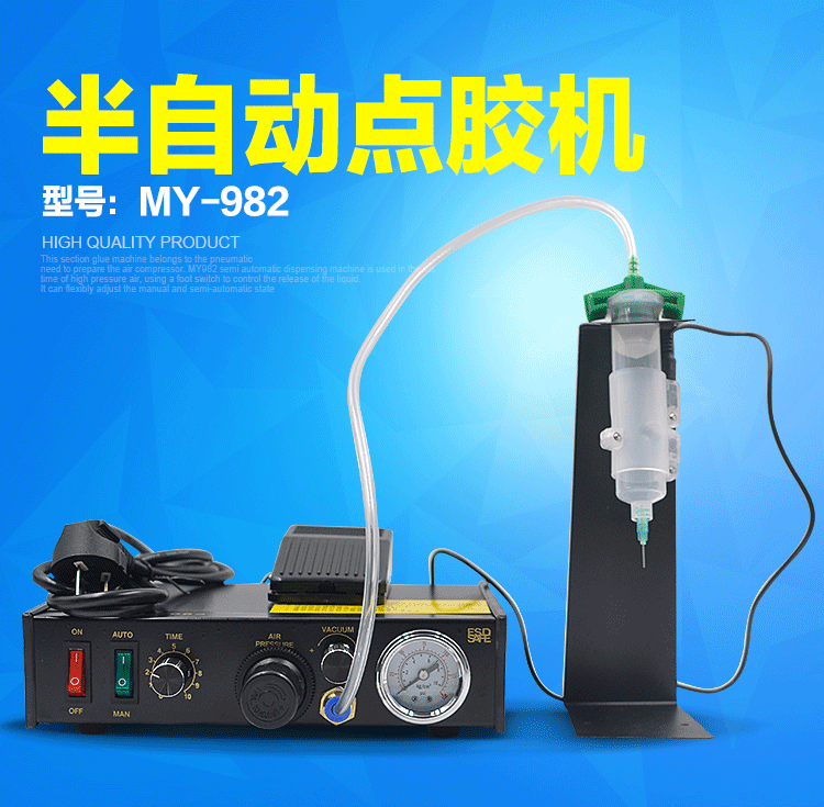 MY—982型半自動(dòng)點(diǎn)膠機(jī)是用高壓空氣在設(shè)定的時(shí)間內(nèi),使用腳踏開(kāi)關(guān)控制把液體推 出;可靈活調(diào)整手動(dòng)、半自動(dòng)狀態(tài),采用高精度數(shù)碼定時(shí)控制器,精準(zhǔn)控制每次滴定時(shí)間,精確到毫秒,正確地控制液料流量,絕不會(huì)浪費(fèi)液料,只需調(diào)節(jié)好氣壓,時(shí)間和選擇適當(dāng)?shù)尼樉准纯桑m合工程/工廠長(zhǎng)期生產(chǎn)使用;有大量現(xiàn)貨供應(yīng),歡迎咨詢(xún)采購(gòu)!