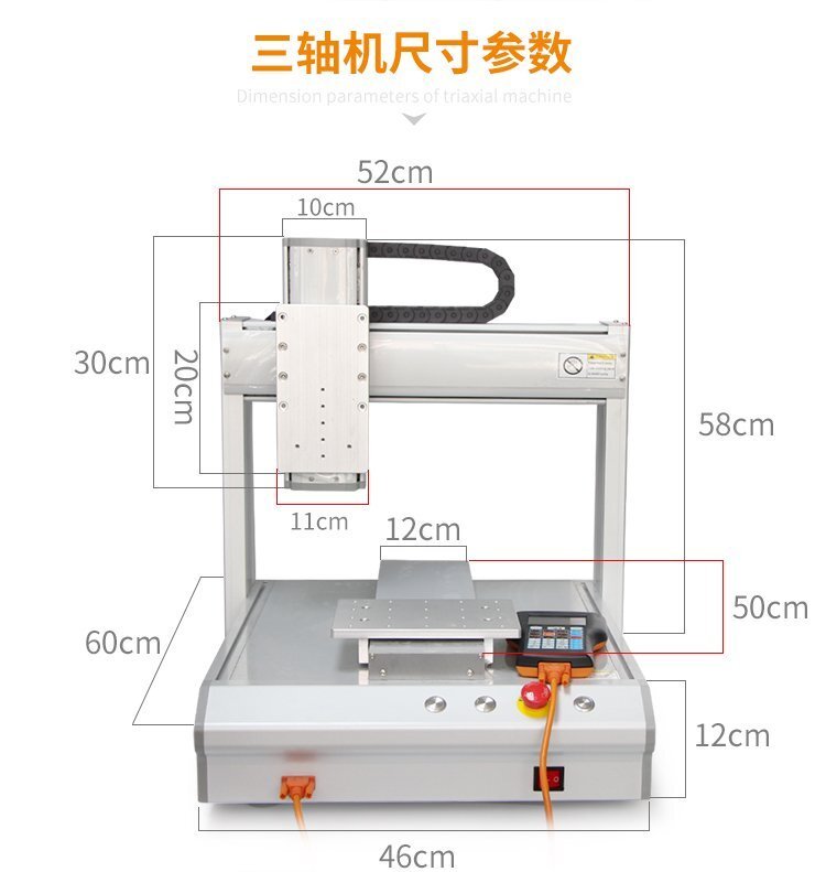 三軸機由本公司自主研發設計,精密加工制造的一款全自動點膠灌膠平臺;主要用在電子行業、LED行業、工藝品行業等廣泛應用,便捷手持盒控制,快速設置編程,導入點膠文檔;具有設置簡單便捷,可打點、畫線、面、弧、圓及不規則曲線;三軸聯動支持陣列展開、圖形預覽、圖庫插入群組編輯等實用功能;可存儲999個點膠工藝文檔,一鍵調出使用;可搭配各種點膠設備組成全自動化單液/雙液點膠套裝,節省多人工,提高工作效率。