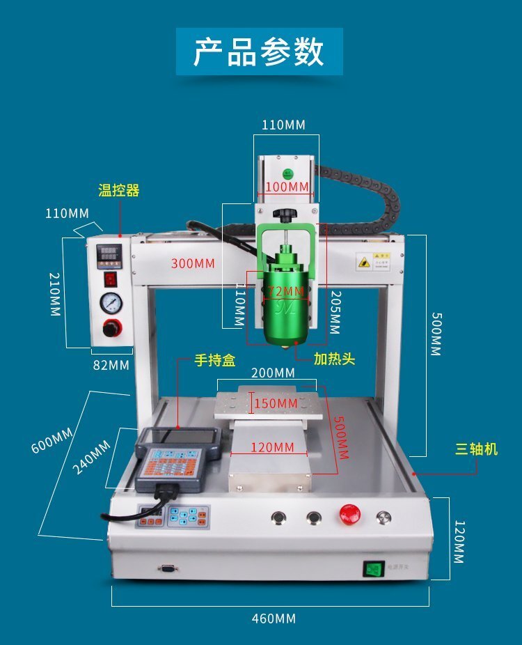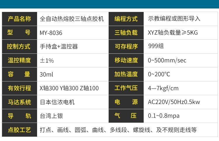 MY-8036是由“331三軸機(jī)+9600溫控器+511PUR點(diǎn)膠閥”組合而成的全自動(dòng)熱熔膠 點(diǎn)膠套裝;三軸機(jī)具有畫點(diǎn)、線、面、弧、圓及不規(guī)則曲線連續(xù)補(bǔ)間,可存儲(chǔ)999個(gè)點(diǎn)膠工藝文 檔;溫控器加熱范圍在0~200℃,具有控制穩(wěn)定、精準(zhǔn)、實(shí)用、操作方便等特點(diǎn);點(diǎn)膠閥加熱速 度快,持久恒溫,耐腐蝕,拆裝簡(jiǎn)單便捷等特點(diǎn);全自動(dòng)點(diǎn)膠,省工省時(shí),提高生產(chǎn)效率。