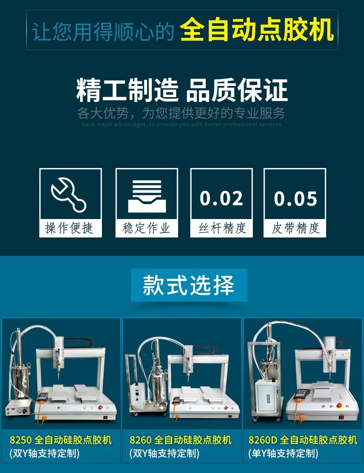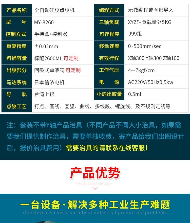MY-8260全自動硅膠點膠機;具有反應快速、出膠穩(wěn)定、精度高、不拉絲等優(yōu)點;點膠行程可做打點、畫線、面、弧、圓及不規(guī)則曲線連續(xù)補間等,還有支持陣列展開、圖形化瀏覽、旋轉、三維橢圓、常用圓形圖庫插入、群組編輯等高級功能;全自動點膠作業(yè)、應用領域廣泛、使用壽命長、節(jié)省成本提高生產(chǎn)效率等優(yōu)勢;